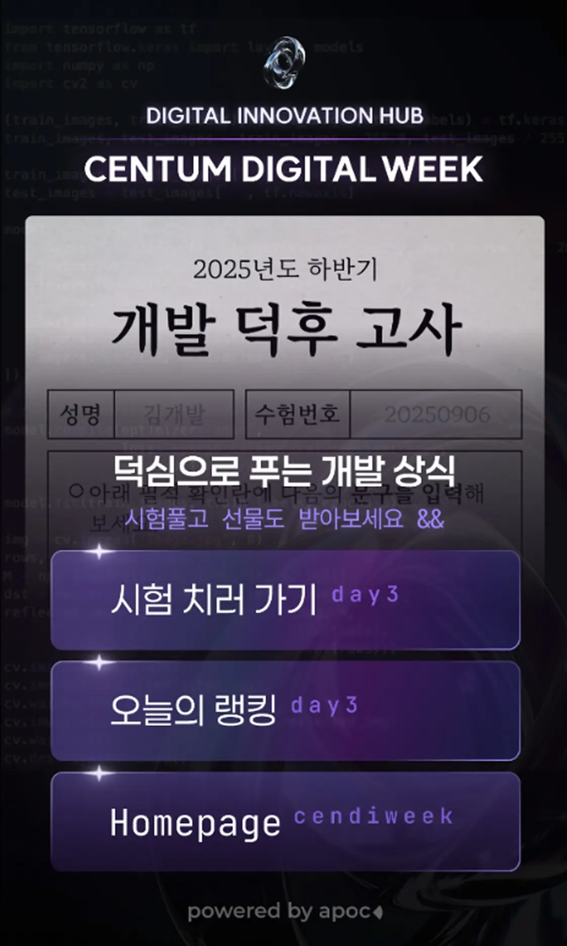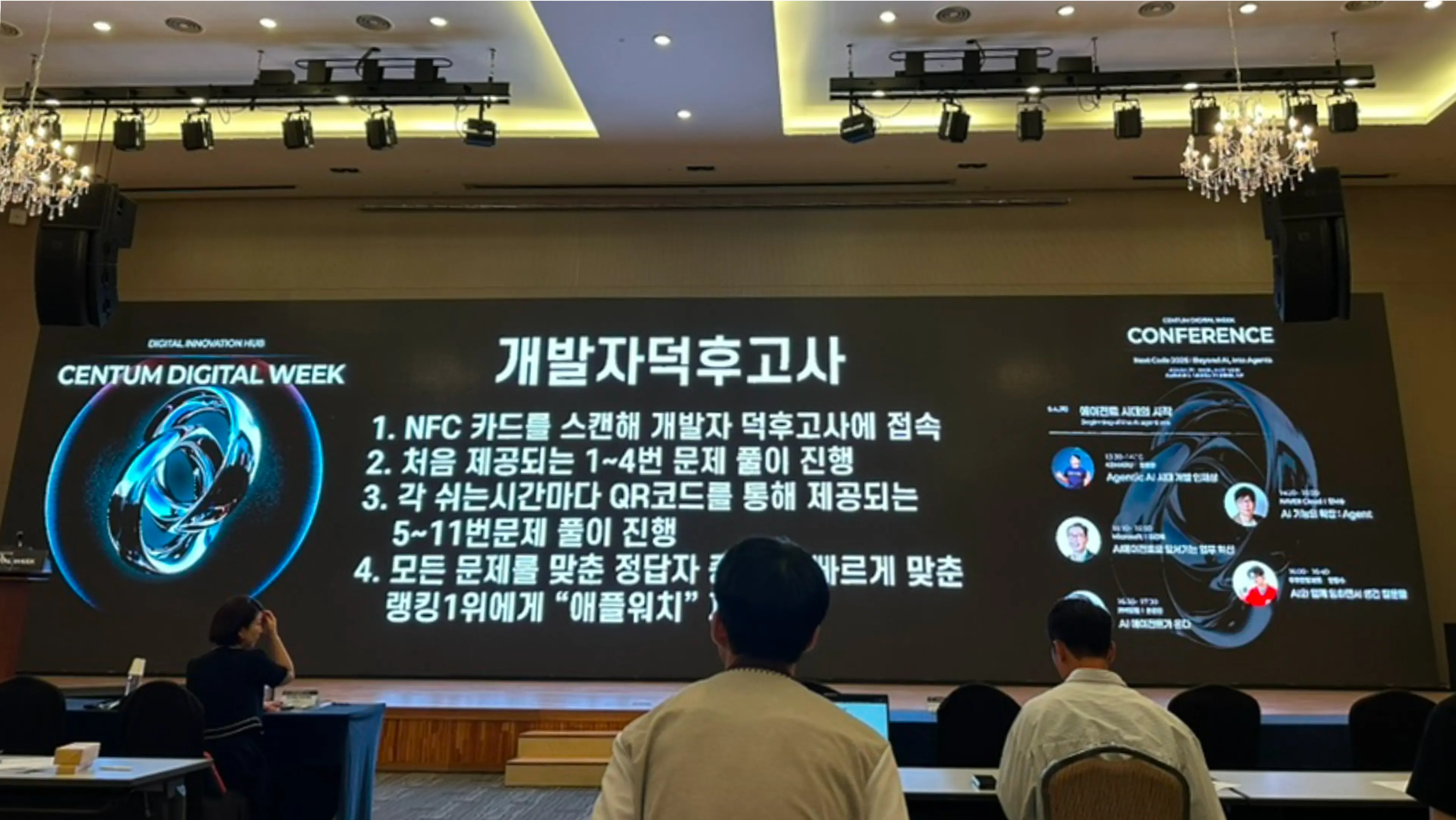 참가자는 NFC 명찰을 입장부터 퇴장까지 하나의 참여 도구로 활용합니다. 매일 개발상식 도전의 소소한 보상과 덕후고사 애플워치라는 강력한 목표가 3일 내내 참가자를 컨퍼런스에 적극적으로 몰입하게 만드는 구조를 설계했습니다.