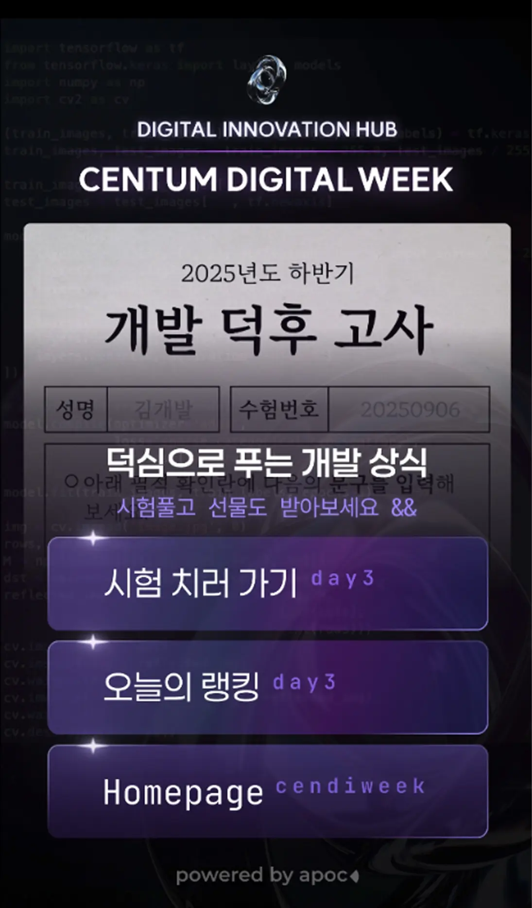 NFC 명찰을 키오스크에 태그하면 그날의 개발상식 문제가 열리고 순위권 입상 시 현장 선물이 지급되는 일일 도전 구조