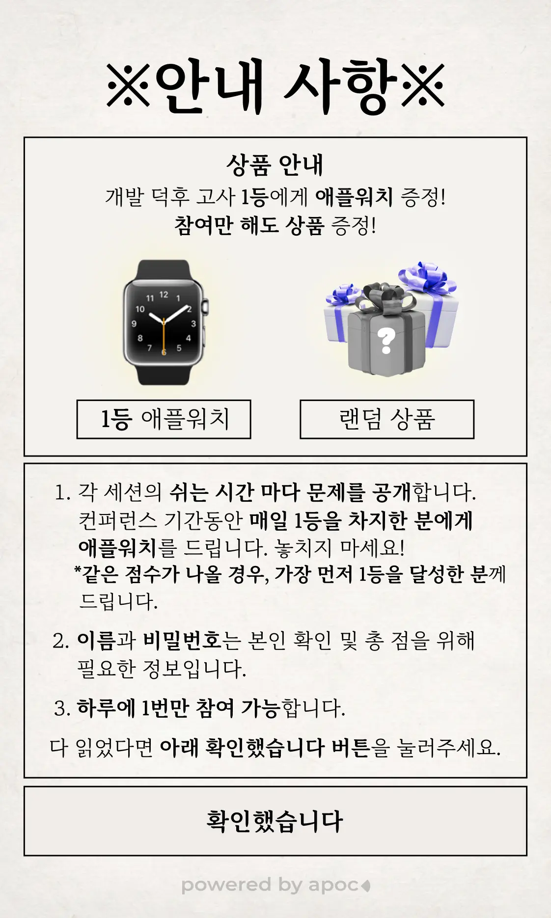 11문항 전체 정답자 중 가장 빠른 제출 1위에게 애플워치를 수여하는 고강도 보상 구조로 몰입과 경쟁심을 극대화