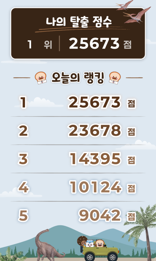 엑스포의 공룡 테마와 브레드이발소 캐릭터를 결합한 ‘공룡 추격 탈출’ 콘셉트로 현장 맥락에 딱 맞는 게임 설계