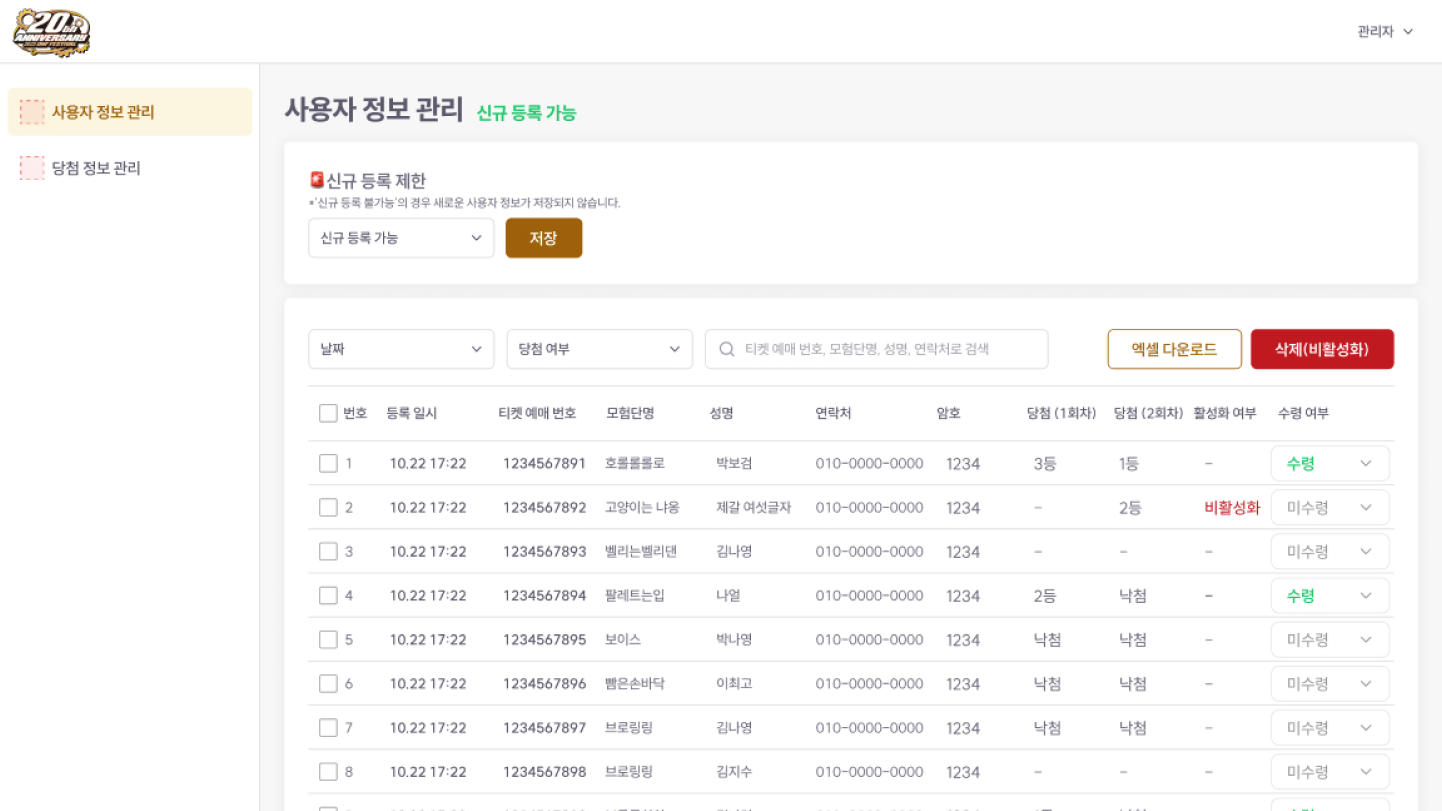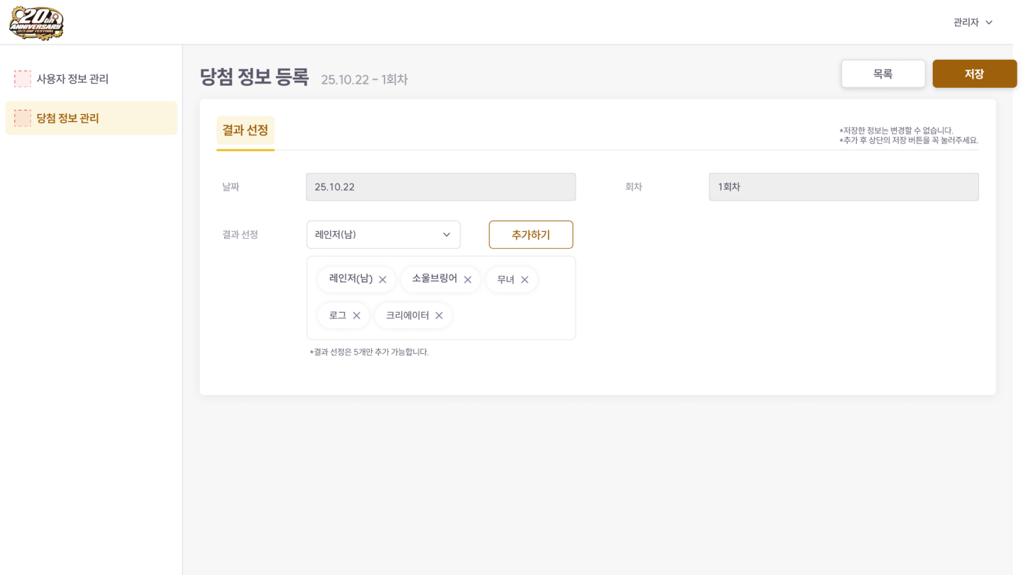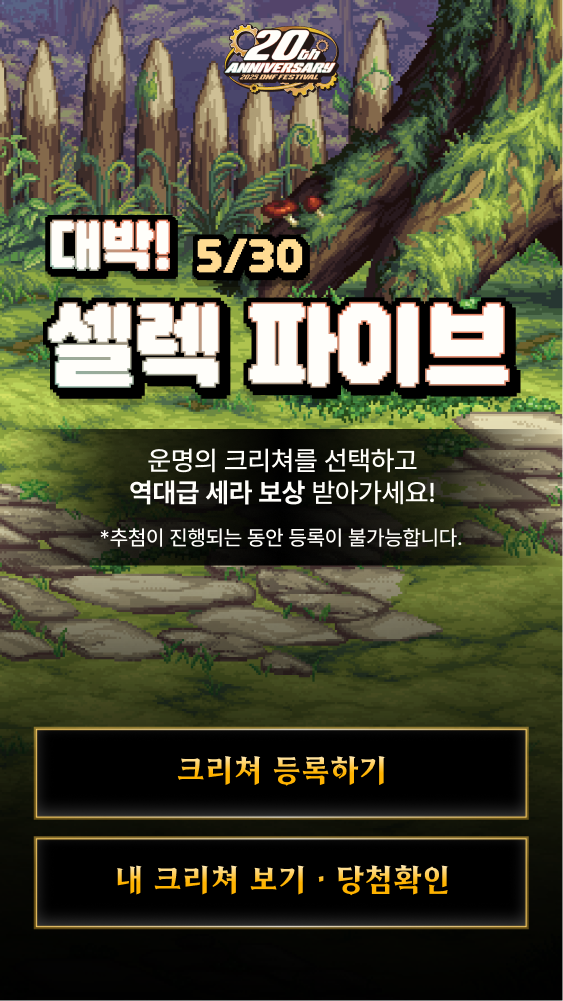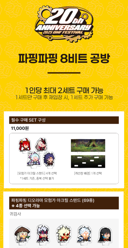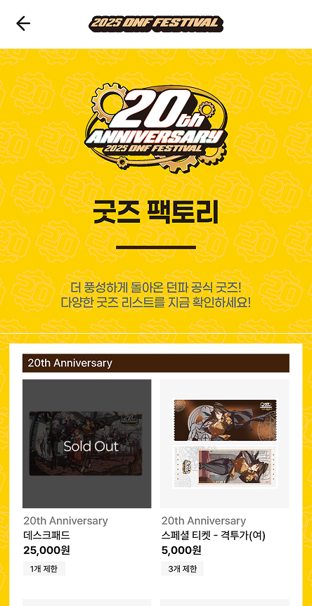 던전앤파이터 20주년 페스티벌에 로또 이벤트 시스템과 실시간 굿즈 재고 안내 페이지 콘텐츠입니다. QR 기반 ‘셀렉 파이브’ 추첨 이벤트에 참여하고 굿즈존 재고 페이지를 통해 현장 구매 정보를 확인하며 효율적인 팬 참여 경험을 제공하였습니다.