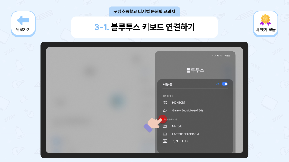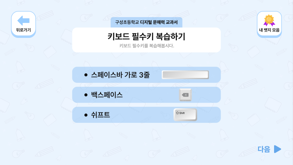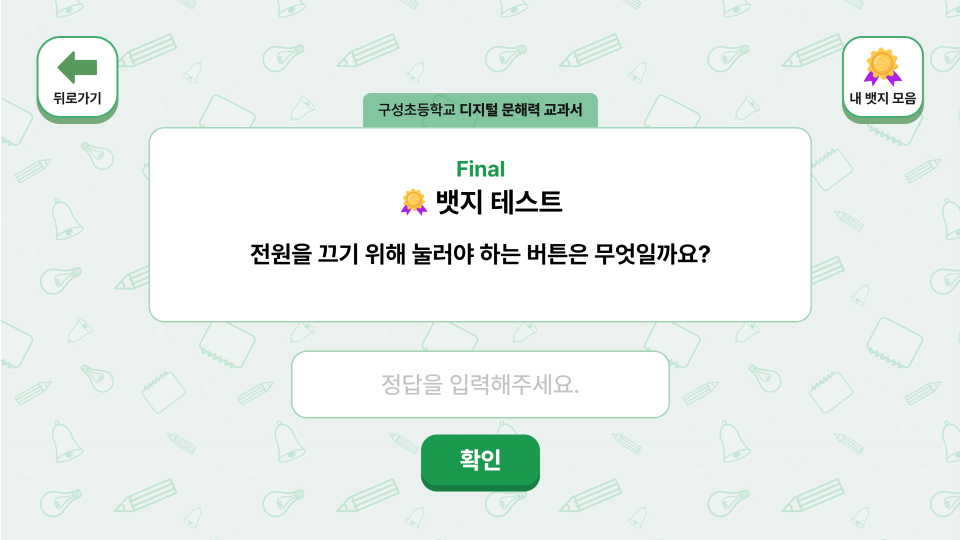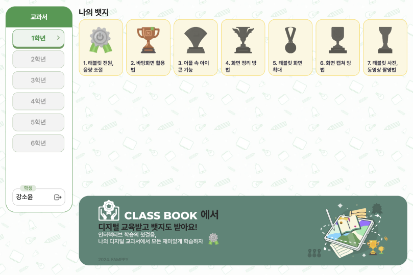 학년별 디지털 리터러시 교육과 OX퀴즈·객관식·주관식 문제를 연계해 정답을 맞출 때마다 뱃지를 수집하는 학생용 콘텐츠와, 선생님이 학생별 학습 진도와 뱃지 현황을 실시간으로 관리하는 교사용 관리자 페이지를 함께 제작한 에듀테크 콘텐츠입니다.