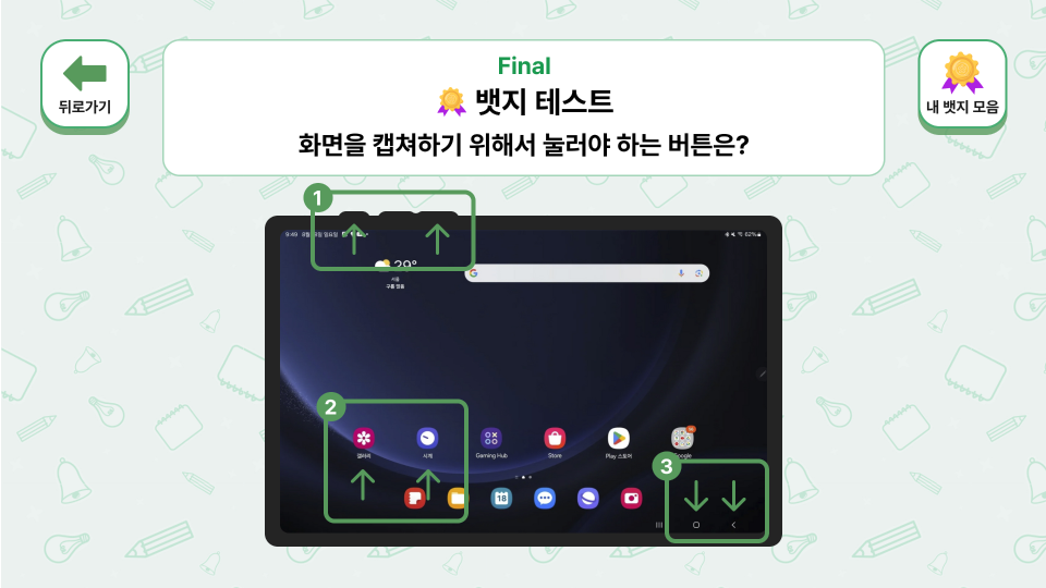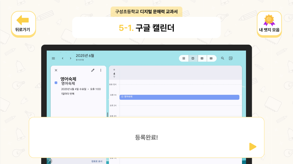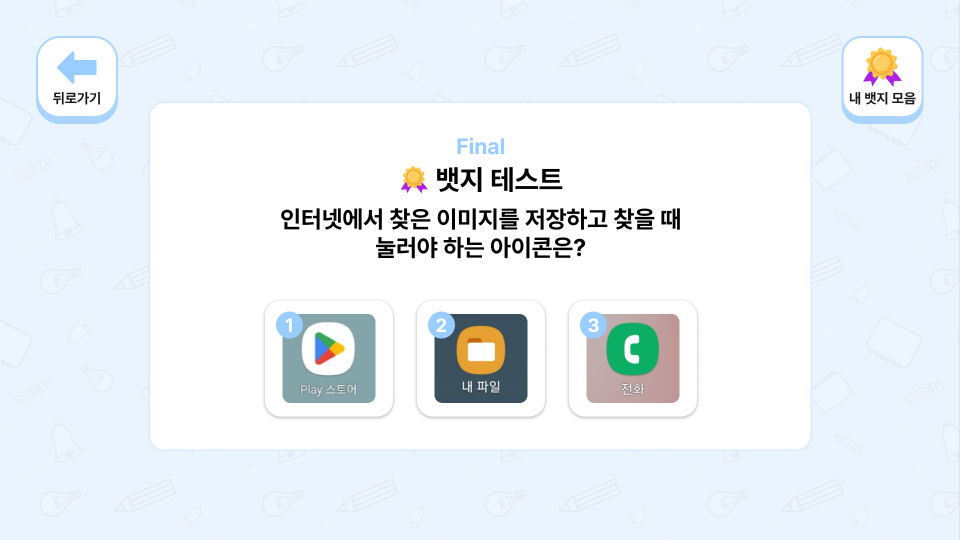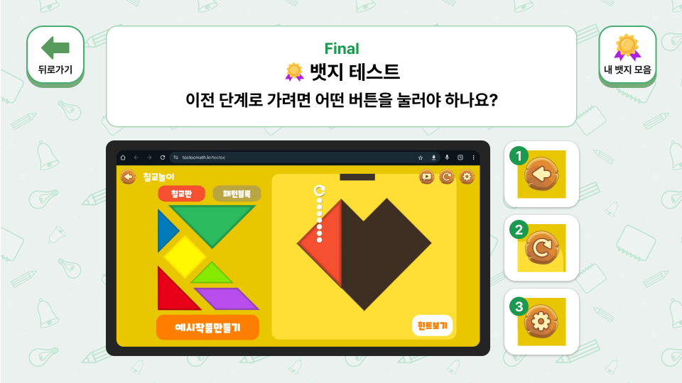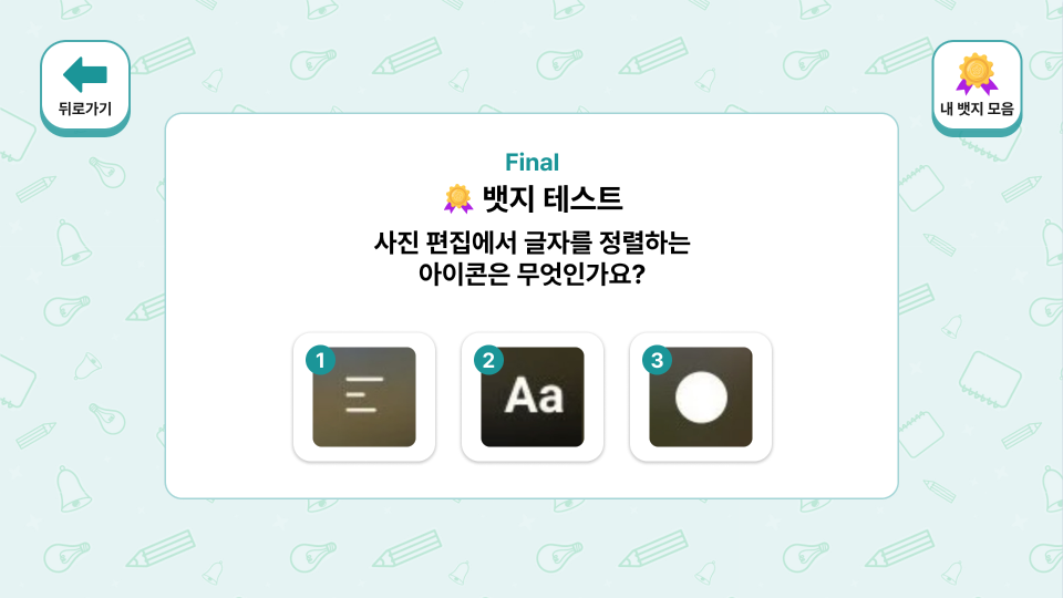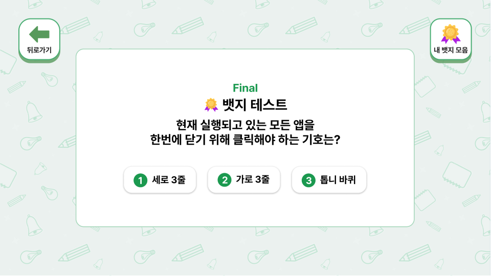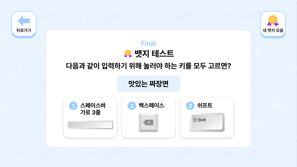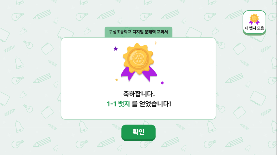 정답마다 뱃지를 획득하는 구조로 학습 성취감과 지속적 참여 동기를 자연스럽게 형성
