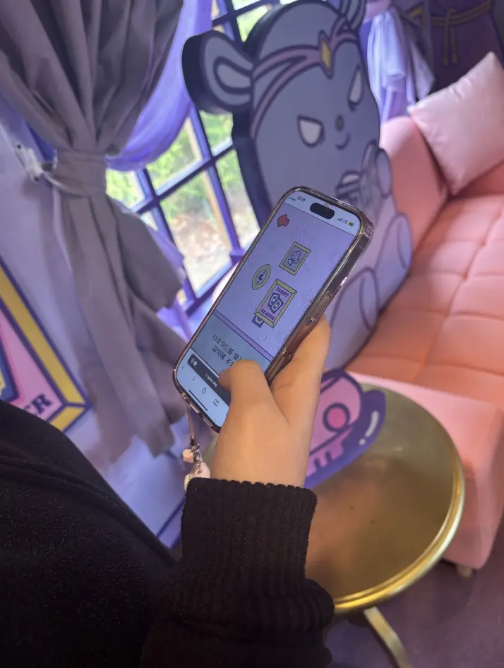관람객은 스마트폰 카메라로 공간 포인트를 인식하며 쿠로미의 집 구석구석을 능동적으로 탐색합니다. 발견한 포인트에서 AR 타로카드로 오늘의 운세를 뽑고 캐릭터별 개인화 메시지를 받는 체험까지, 관람객의 물리적 이동이 곧 콘텐츠 참여가 되는 액티브 인터랙션 구조로 설계했습니다.