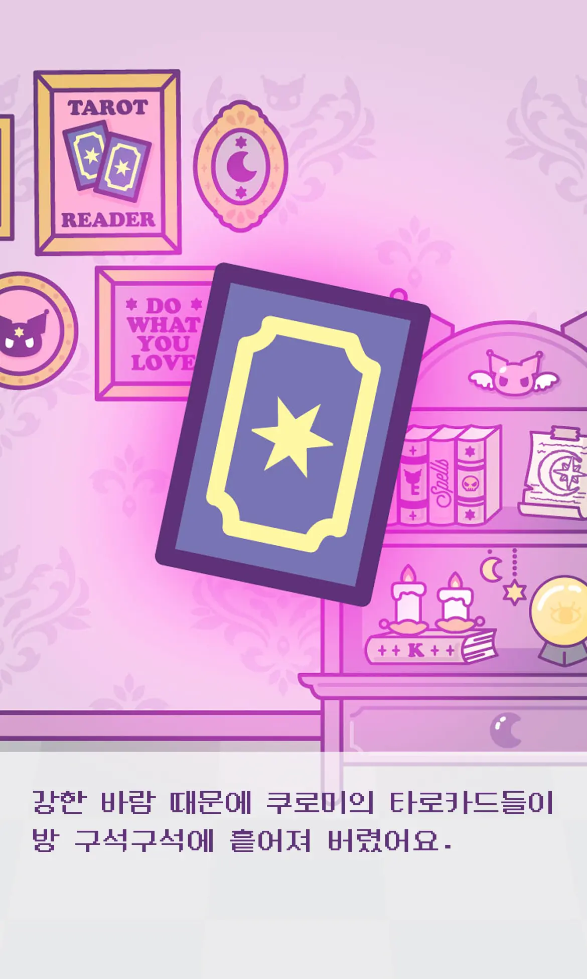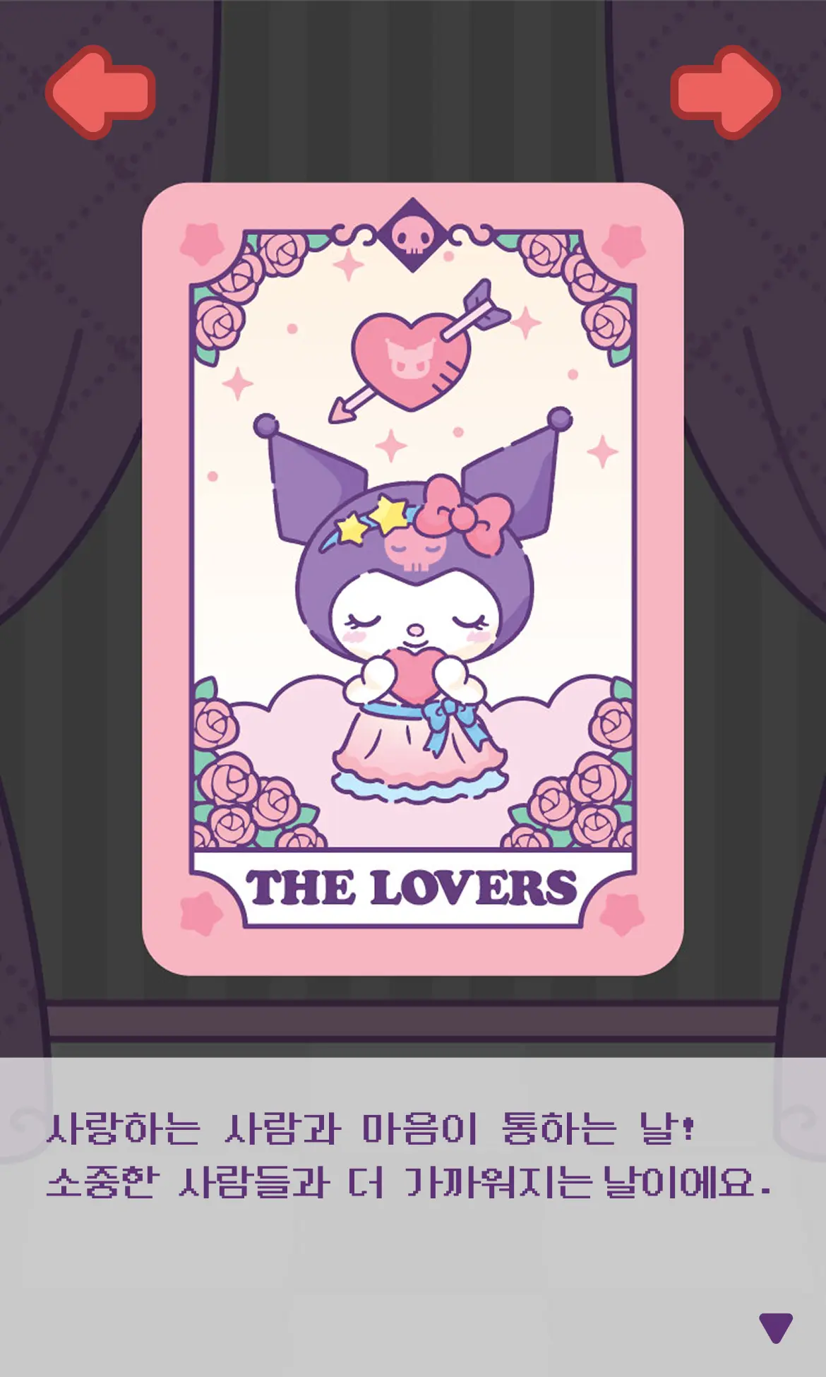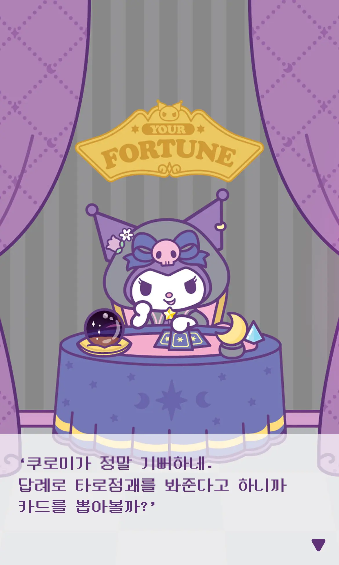 쿠로미 세계관 디자인 타로카드로 오늘의 운세를 직접 뽑고 캐릭터별 개인화 메시지를 확인하는 Z세대 감성 콘텐츠