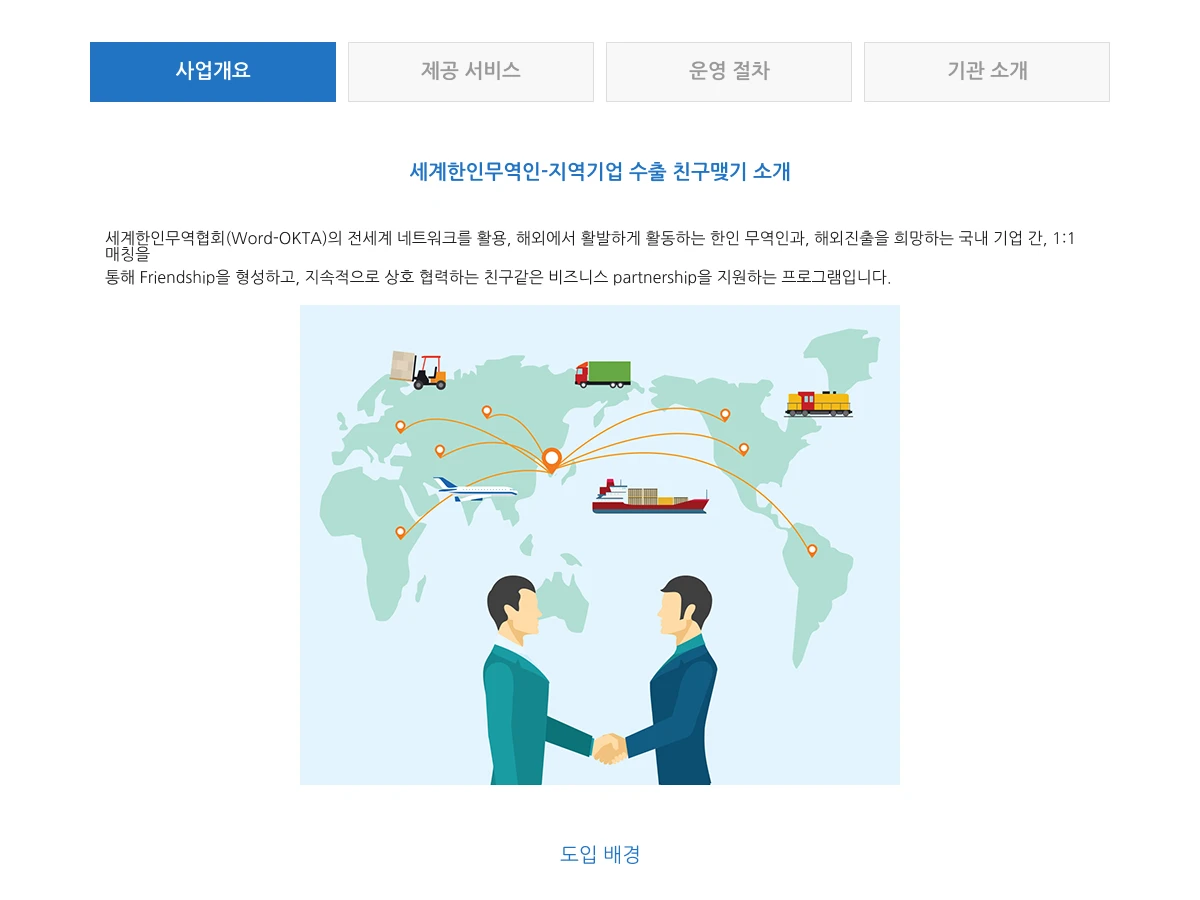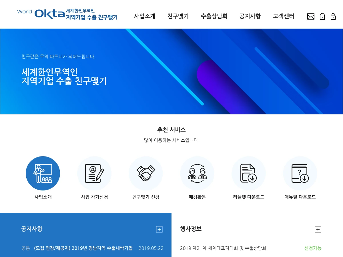 세계한인무역협회(OKTA)의 기존 시스템을 개선하고, 글로벌 회원 간 소통과 비즈니스 기회를 확대하기 위해 신규 홈페이지 및 모바일 앱 구축을 위한 기반을 설계한 프로젝트입니다.