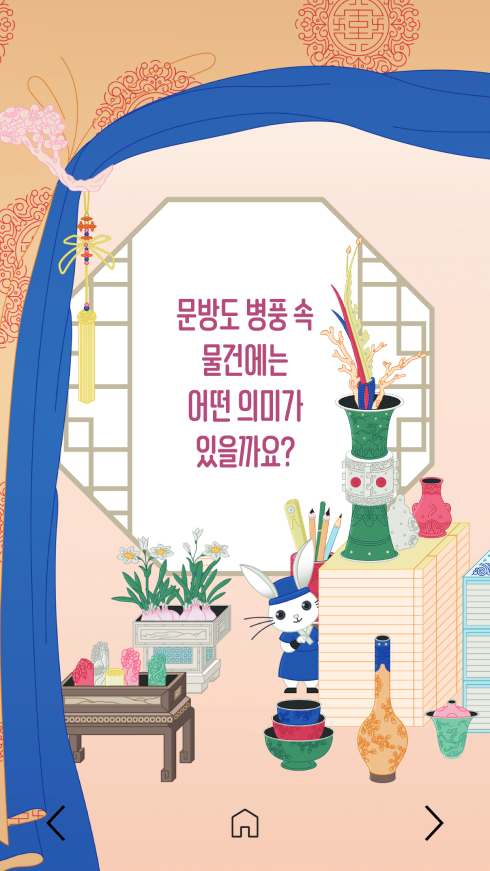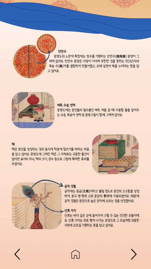‘문방도·일월오봉도·백자도’ 온라인 책자는 관람객이 디지털 페이지를 넘기며 전통 회화를 감상하고 이해할 수 있도록 구성된 온라인 전시 콘텐츠입니다. 사용자는 이미지와 해설이 결합된 페이지를 따라 이동하며 병풍 속 상징과 시대적 의미를 자연스럽게 탐색하게 됩니다.