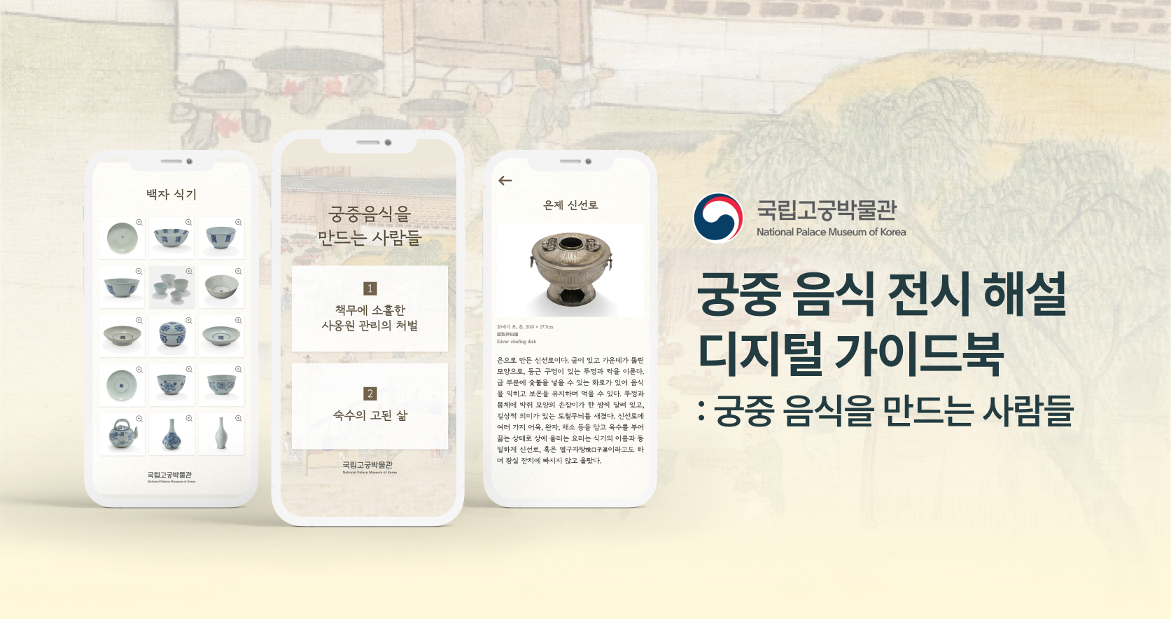 고궁박물관의 주요 유물인 ‘문방도’, ‘일월오봉도’, ‘백자도’ 병풍의 역사적 의미와 미적 가치를 소개하는 온라인 전시 콘텐츠입니다. PC와 모바일 웹에서 열람 가능한 디지털 책자 형태로 제작해, 전통 회화 속 상징과 이야기를 누구나 쉽게 이해하고 감상할 수 있도록 구성했습니다.