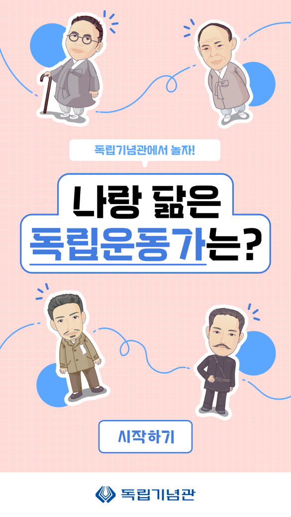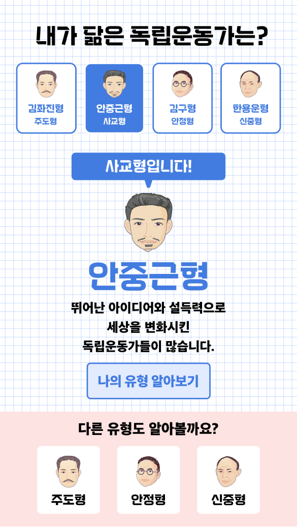 독립기념관에서 ‘나랑 닮은 독립운동가’를 주제로 성향 기반 유형 테스트 콘텐츠를 제작했습니다. 질문 응답을 통해 역사 속 인물과 감정적으로 연결되도록 설계했으며, 교육 현장 활용을 위한 관리자 페이지까지 함께 구축했습니다.