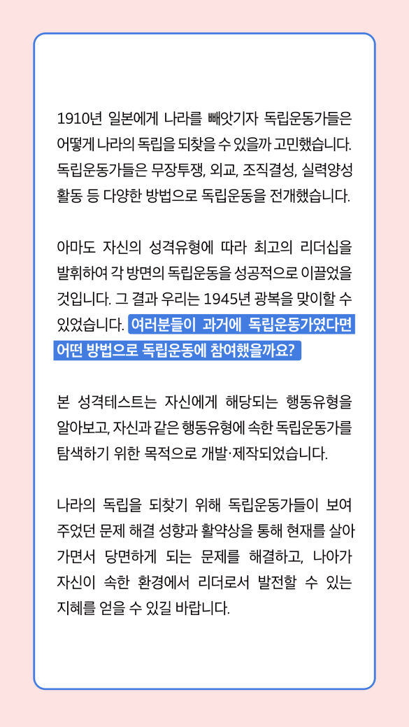 응답 결과를 바탕으로 내면적 성향이 유사한 독립운동가를 매칭해 ‘나와의 연결’을 구체적으로 체감