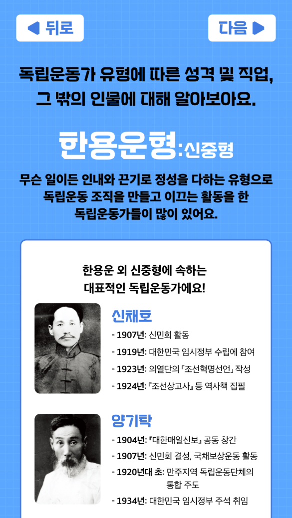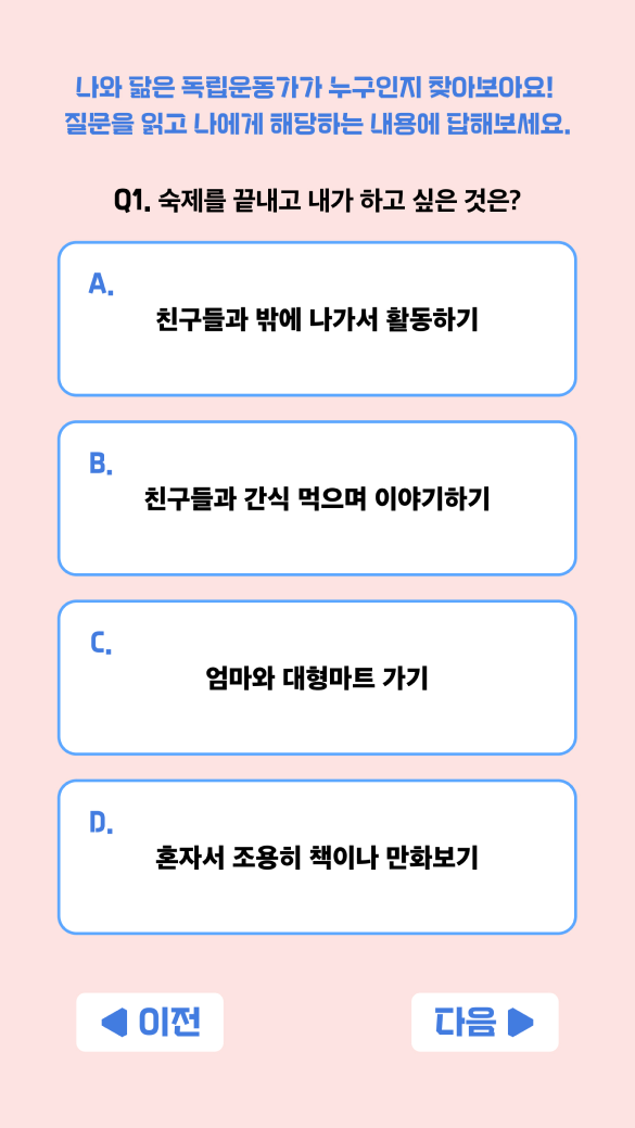 ‘내가 독립운동가였다면 어떤 방식으로 참여했을까?’라는 질문에서 출발해, 선택형 질문으로 성향을 분석하고 자신과 닮은 독립운동가를 매칭받는 디지털 콘텐츠를 기획했습니다. 역사를 외우는 대신 자신의 이야기로 받아들이게 하는 감정 이입 중심의 인물 역사 교육 콘텐츠입니다.