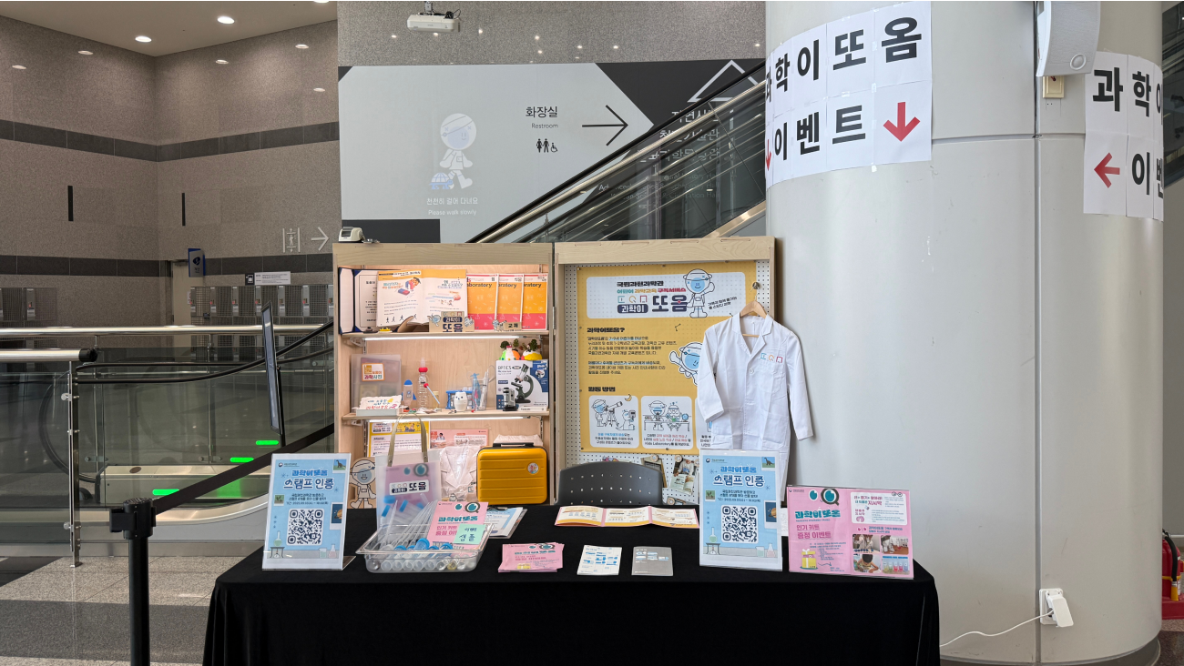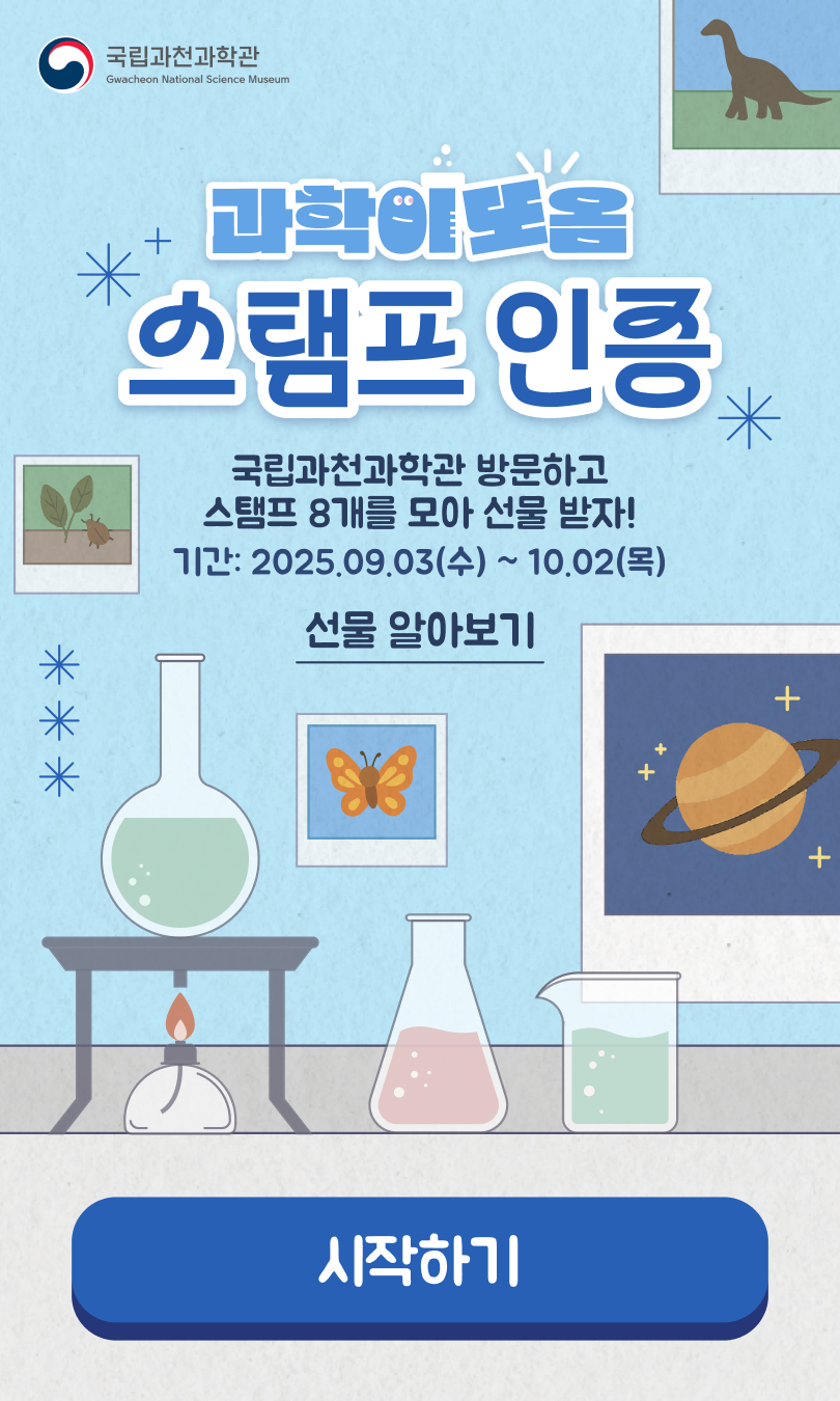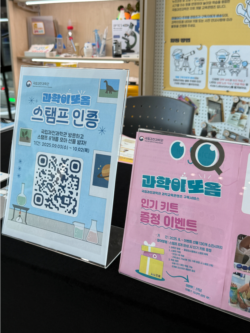 국립과천과학관 중앙전시홀 입구에서 운영된 날짜 스탬프 누적형 재방문 유도 이벤트입니다. 방문마다 스탬프를 기록해 8개를 완성하면 ‘과학이 또옴’ 과학 실험 키트를 보상으로 제공하는 구조로, 단순한 방문 기록을 목표 달성 게임으로 전환해 어린이와 가족 관람객의 지속적인 과학관 방문을 유도했습니다.