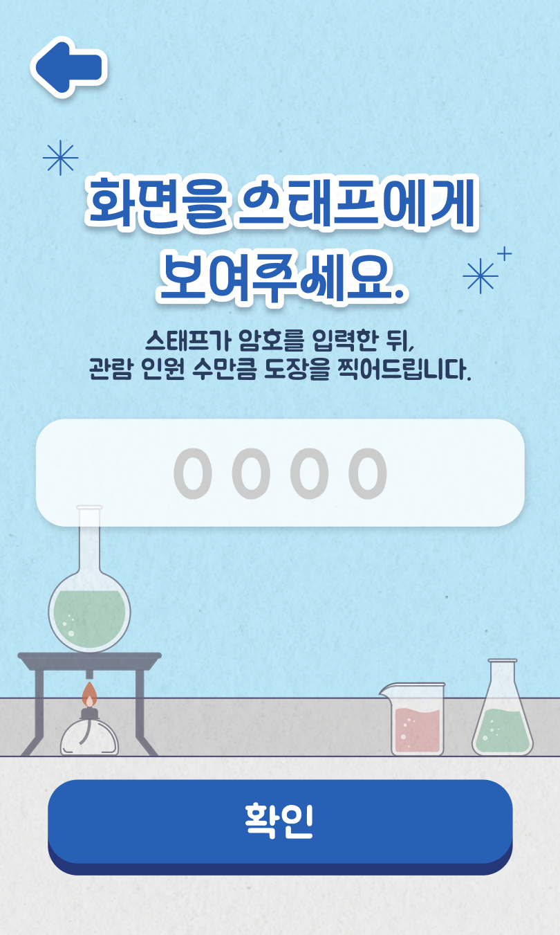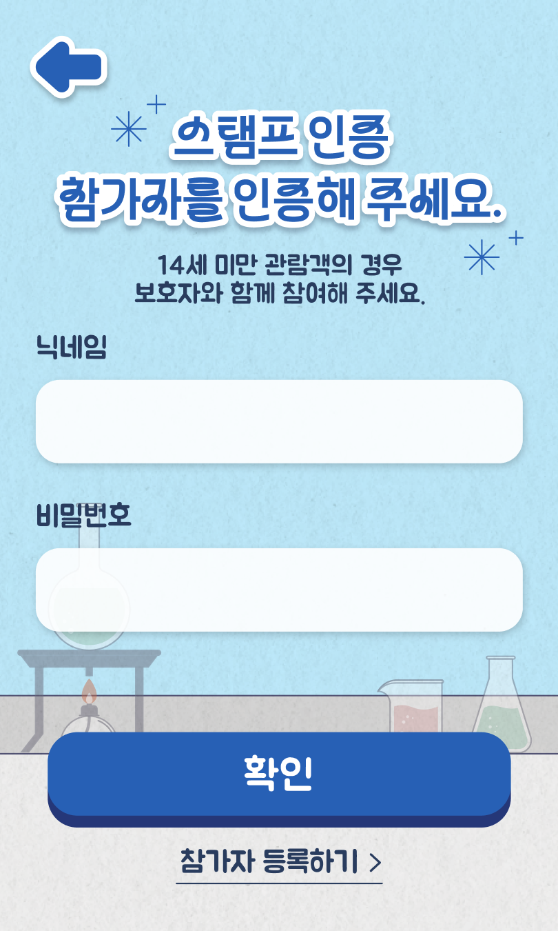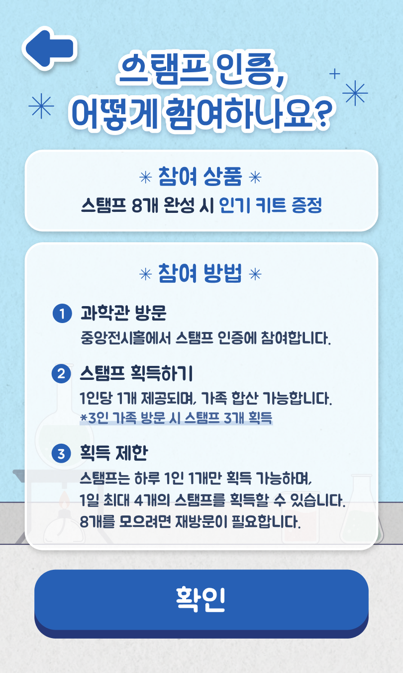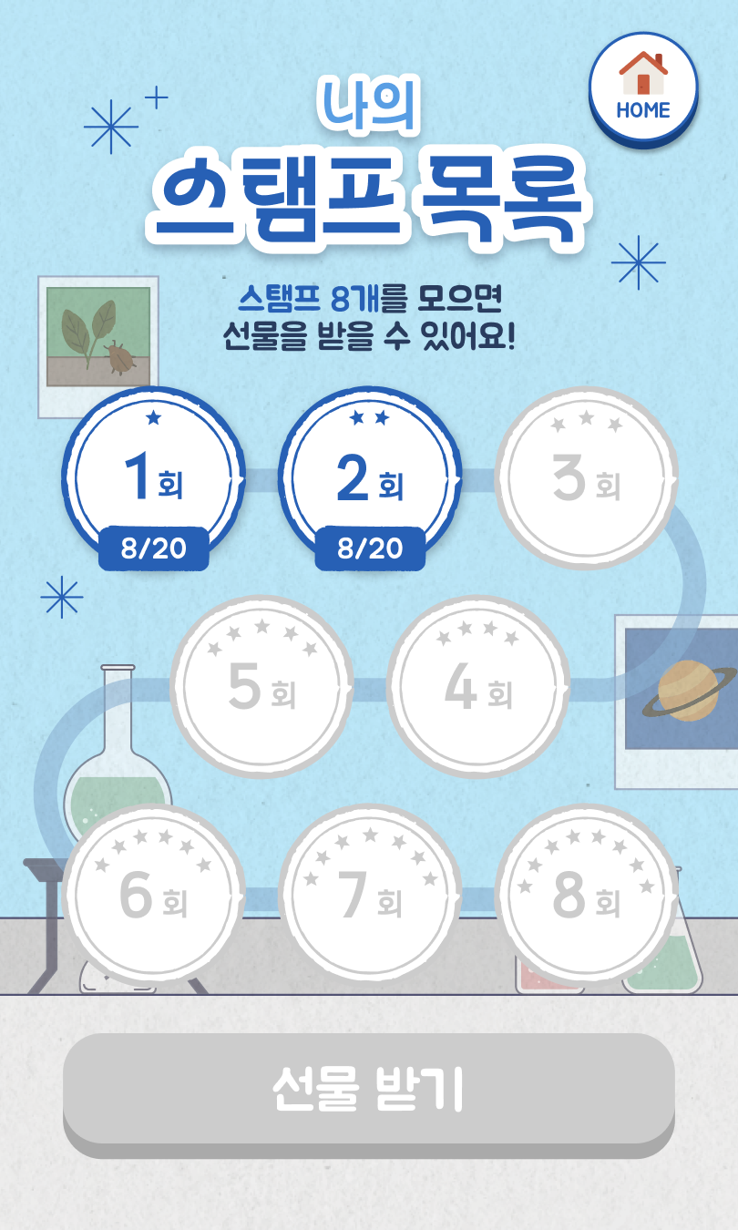 참여자는 과학관 방문 시 중앙전시홀 입구에서 날짜 스탬프를 인증하며 방문 기록을 누적합니다. 총 8개 스탬프 완성이라는 명확한 목표가 다음 방문의 이유를 만들고, 과학 실험 키트라는 과학 체험과 연결된 보상이 참여 동기를 더욱 강화하는 구조로 설계했습니다.