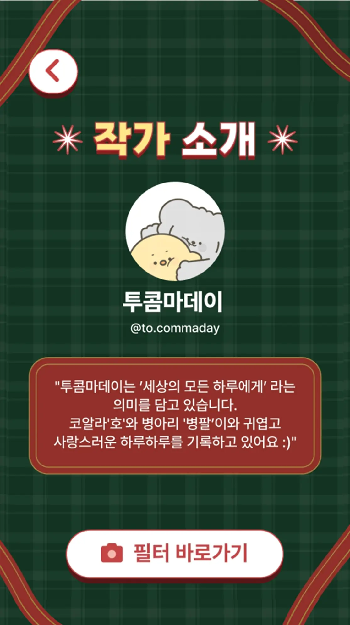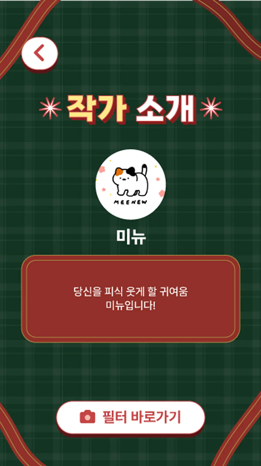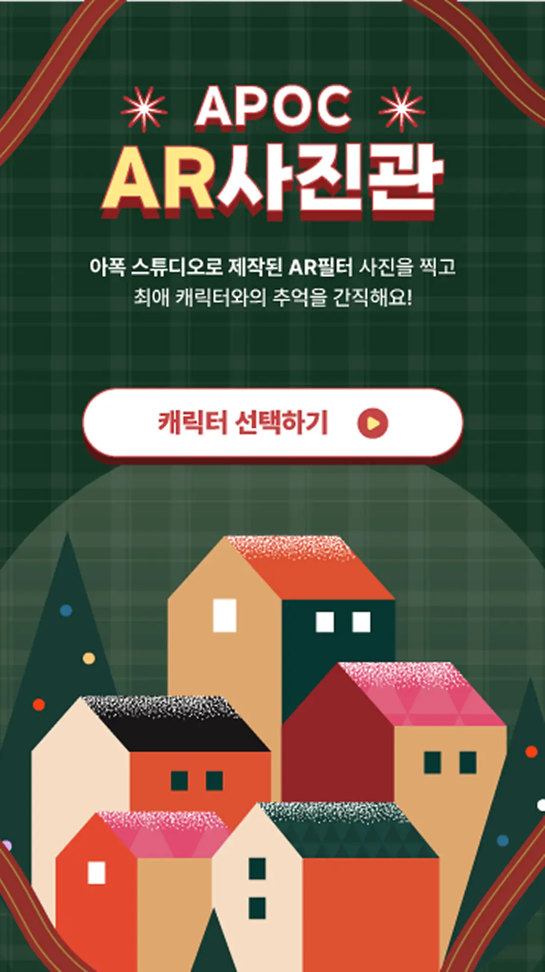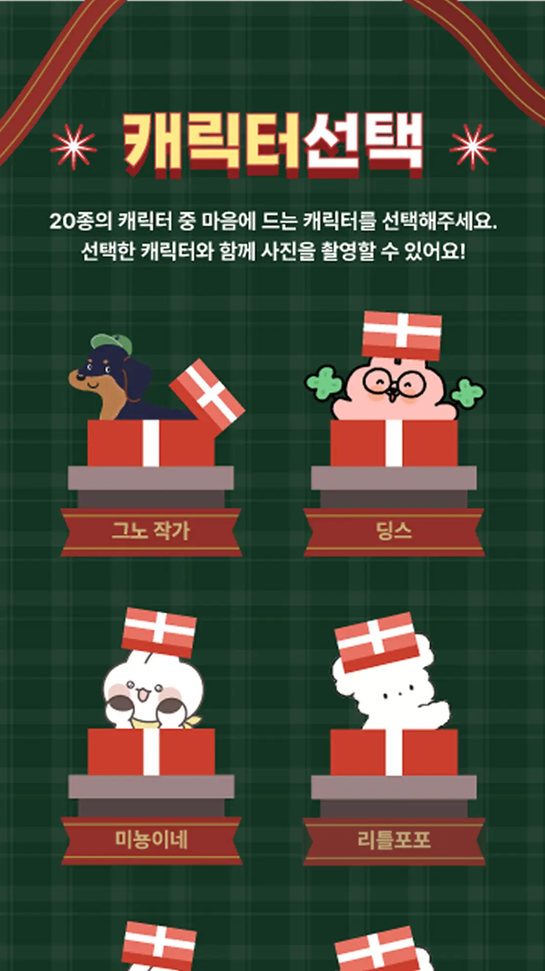 관람객은 ‘시작하기’ 버튼 하나로 21명 작가의 AR 필터를 직접 선택하고 즉시 촬영할 수 있습니다. 각 필터는 작가 고유의 스타일과 크리스마스 테마가 결합된 형태로, 어린이부터 성인까지 전 세대가 직관적으로 자신의 취향에 맞는 일러스트 세계를 손쉽게 체험할 수 있도록 설계했습니다.