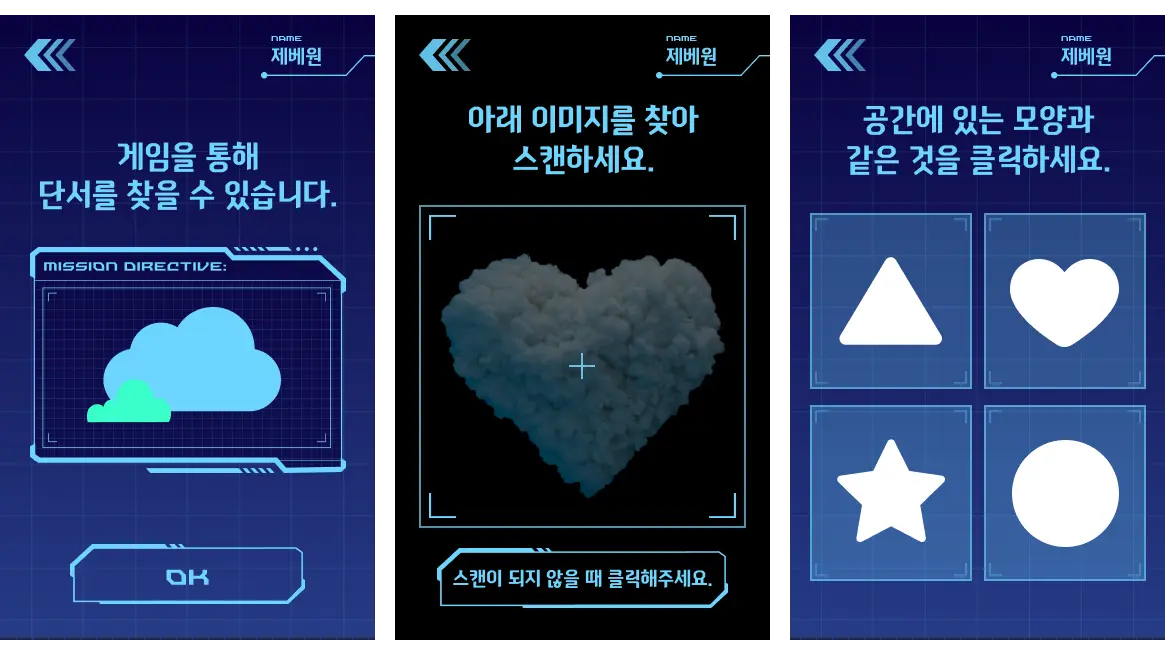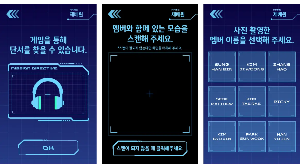 팬은 포토카드·조형물·이미지·AR 필터 등 다양한 입력 방식으로 각 존의 미션에 참여합니다. 단서 수집이라는 명확한 목표가 팬을 공간 곳곳으로 능동적으로 이끌며, 각 존에서 발견하는 멤버의 메시지와 간접 대화는 세계관 서사를 점층적으로 완성해 나가도록 설계했습니다.