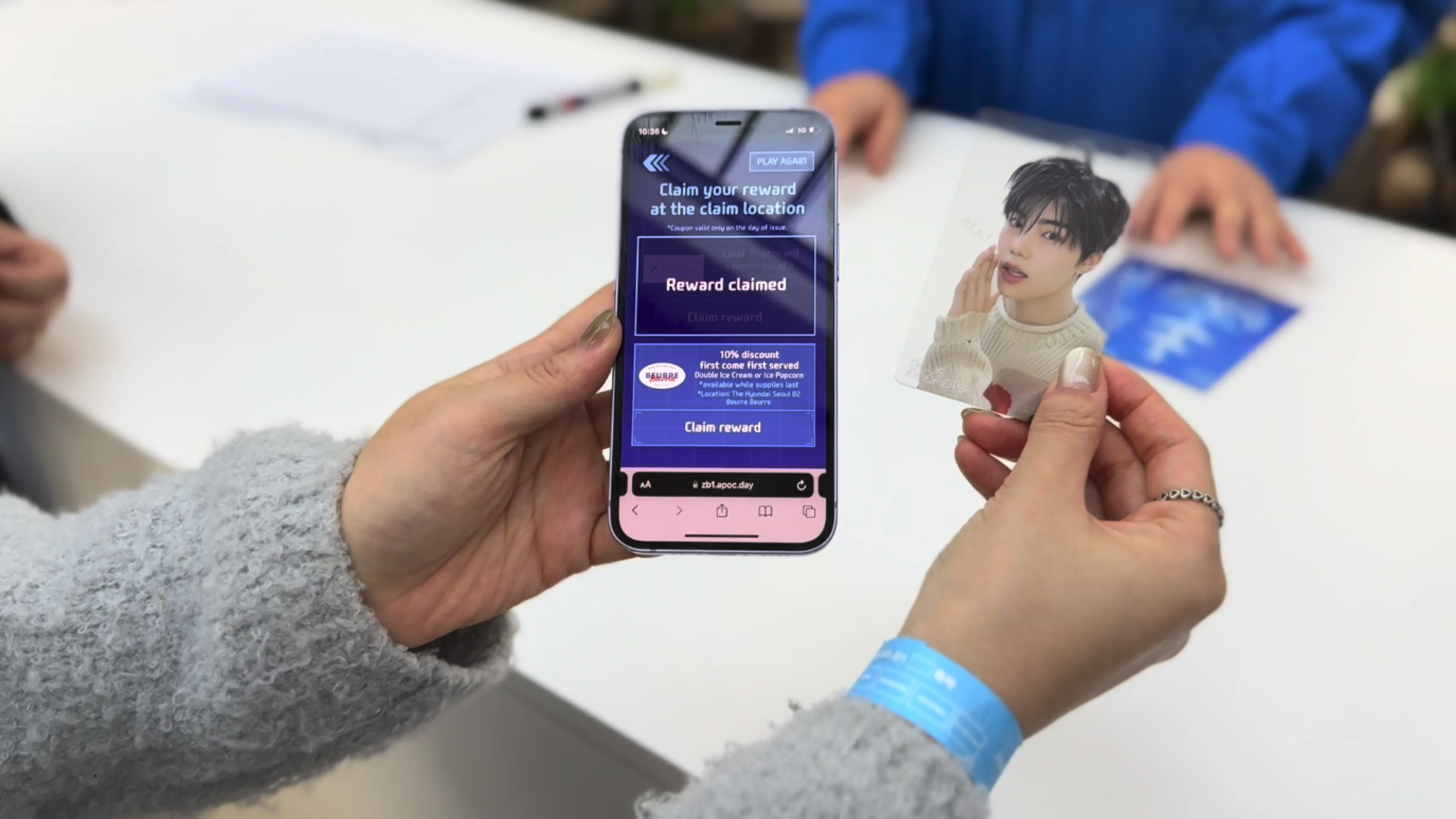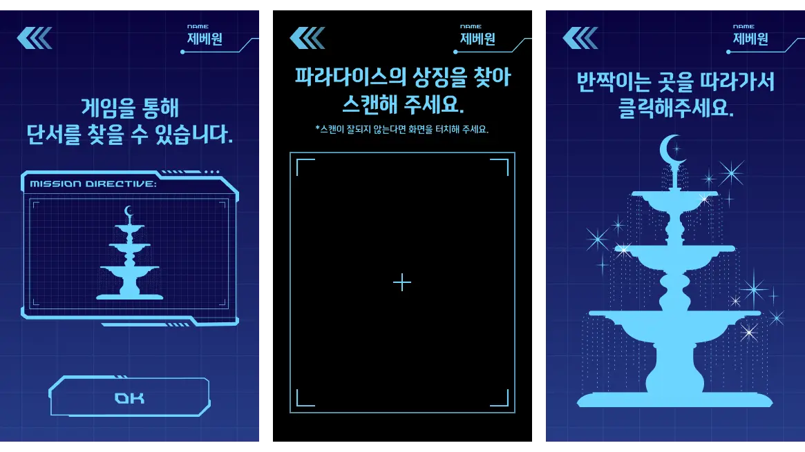 제로베이스원의 세계관을 기반으로 가상 전화로 시작되는 서사 속에서 팬이 4개 테마존의 단서를 찾아 블루 파라다이스를 완성해 나가는 팝업 인터랙티브 콘텐츠를 기획했습니다. AR 인식·클릭 게임·차이 찾기 등 다양한 미션과 오프라인 동선을 유기적으로 결합해 스토리와 상호작용이 하나가 되는 몰입형 팬 체험을 구현했습니다.